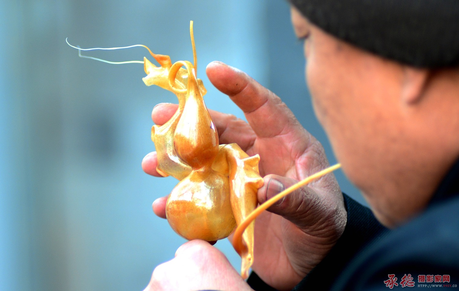 特写手法表现的糖人制作,作为主体的糖人,造型色彩,都非常不错;人物及背景的虚化都有利于突出葫芦型的糖人,虚实对比运用不错。从命题看,对“吹”没有直接表现,是有意为读者留的想象空间吧?