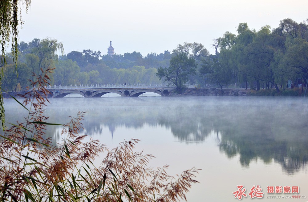 薄雾轻抚水面,为秀丽的山庄增添了神秘感。拍摄精彩!