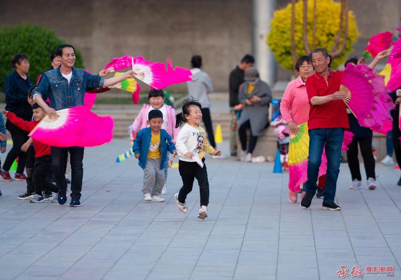 大面积色彩对比,使画面鲜艳夺目,嬉戏的儿童穿插进自娱的老人队伍,生动有趣。如果对主题进一步提炼,并有效地利用摄影语言突出主题,就要出大片了