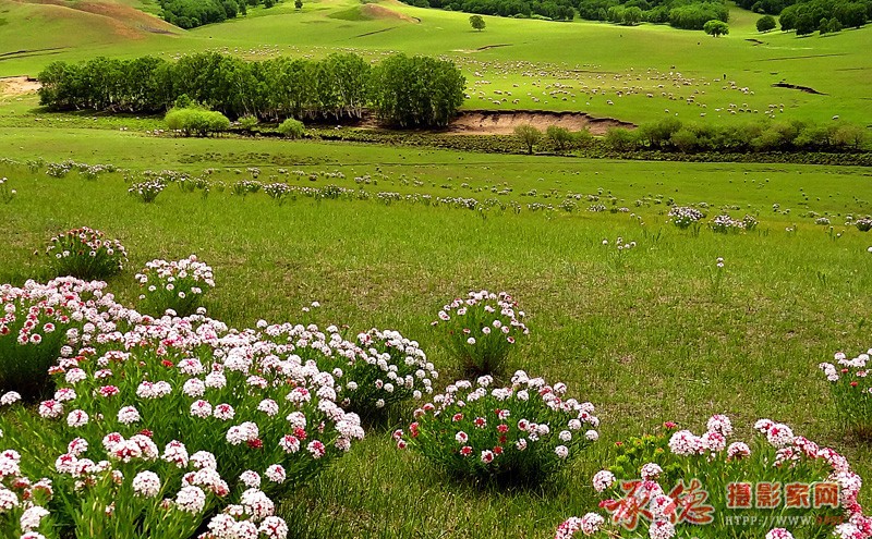 视野开阔,前景的狼毒花,远景的羊群,前后景色互相映衬,描绘出一幅夏日草原美景。(但愿草原狼毒花别总这样茂盛,不然再过几年风吹的就不是草地牛羊了。所以这幅图片也是一幅环保示警片。)