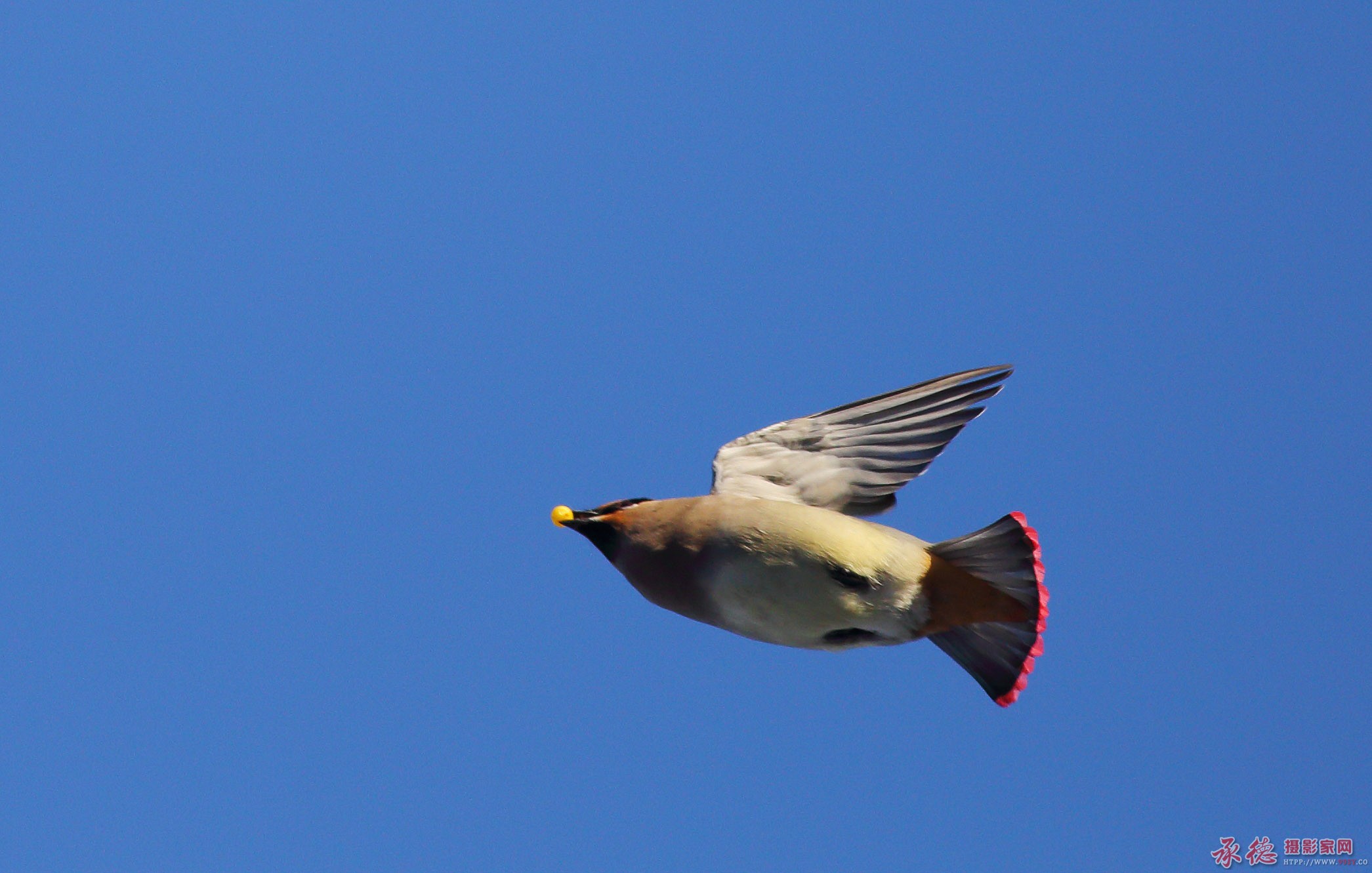 太平鸟一共分为两种,这个是小太平鸟,背景蓝天非常干净漂亮。