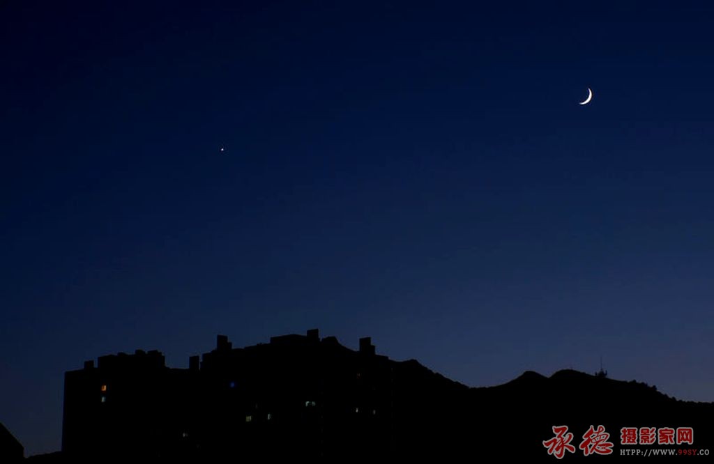 空旷幽蓝的夜空,一弯新月,一颗长庚星,之下是建筑与远山的剪影。这样的画面让人遐想。大面积的夜空与只有不到四分之一面积的剪影相对,造成一种幽静深远的意境。欣赏学习。