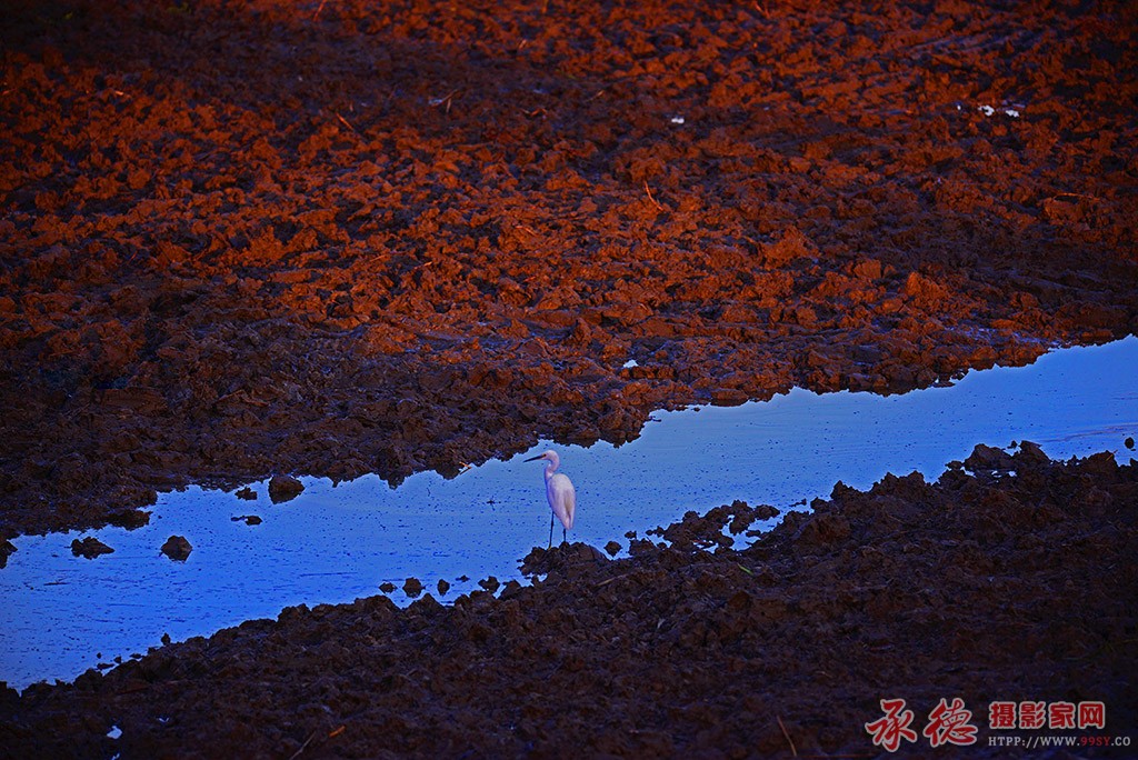 光影漂亮 ,美丽的红海滩, 静静的河流 ,孤独的白鹤等鱼还是等伴?