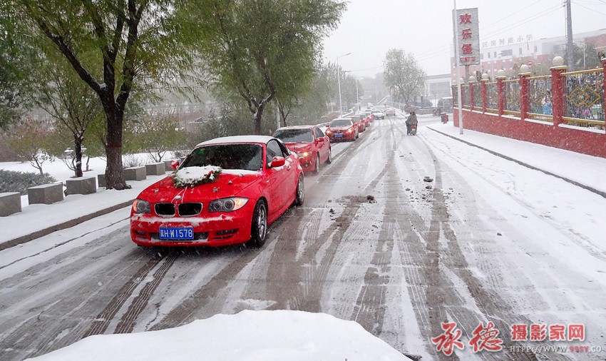 好漂亮的迎亲花车,雪白的路面,红色的小轿车,色彩亮丽,吸人眼球,十分欣赏精美佳作。
