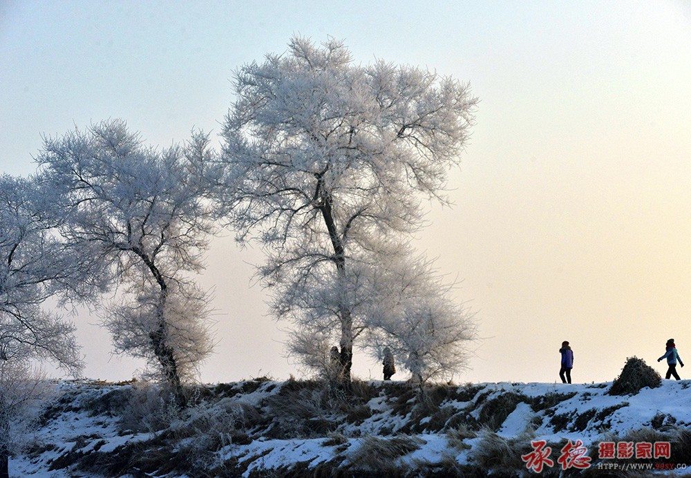 漂亮的雾凇,洁白如玉,质感极佳,清晰通透,人物点缀给画面增添了故事情节,十分欣赏精美佳作。