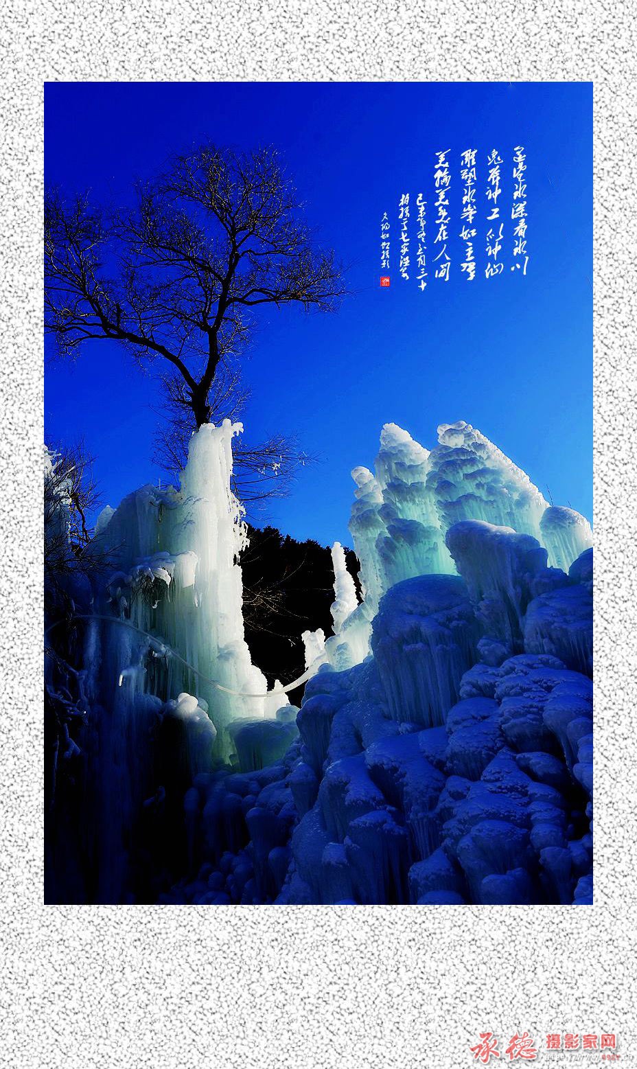 本帖最后由 夕阳如虹 于 2016-1-10 19:59 编辑 遥望冰瀑看冰川 鬼斧神工似神仙 雕塑冰峰如玉翠 美轮美奂在人间