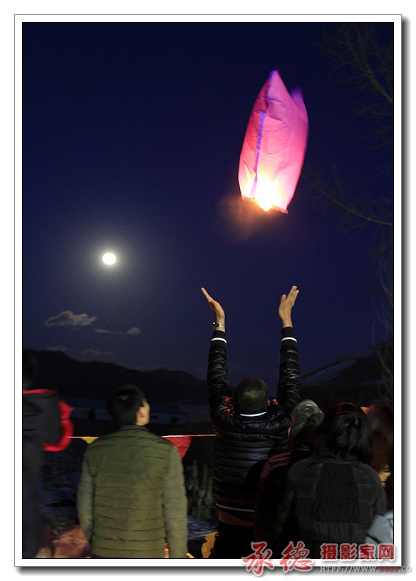 明月与孔明灯遥相呼应,构成一幅和谐的画面,漂亮。