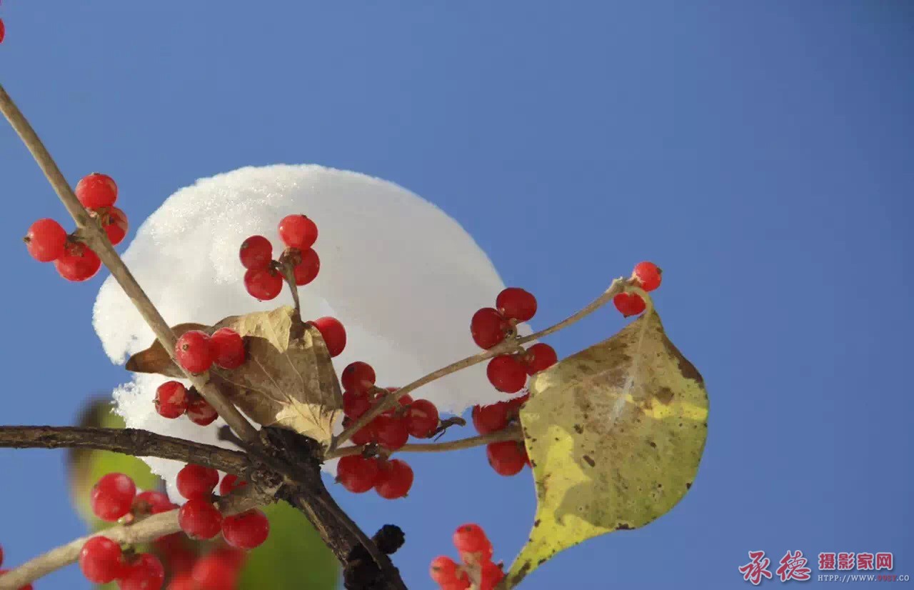 两片叶子映着光影 红红的忍冬果上白白的雪团拍摄的漂亮 好拍欣赏