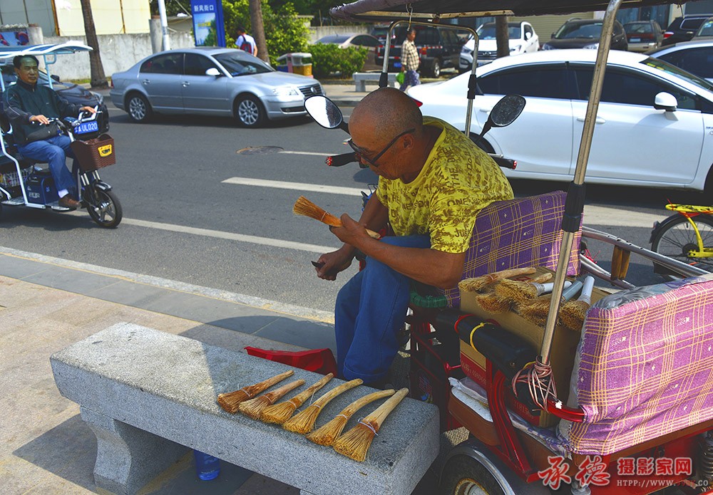 这位老人用椰子把做成的炊除,五元一把。这是废物利用,绿色环保的好炊具。