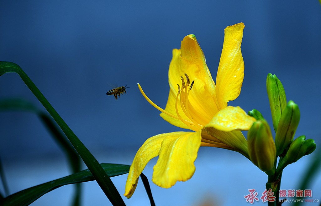 惠风和畅 发表于 2016-7-15 19:34 蓝色背景衬托黄色花朵非常艳丽 小蜜蜂抓拍的精彩 欣赏