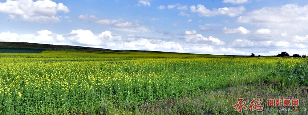 视野开阔,蓝天白云,遍地黄花,场景壮观.