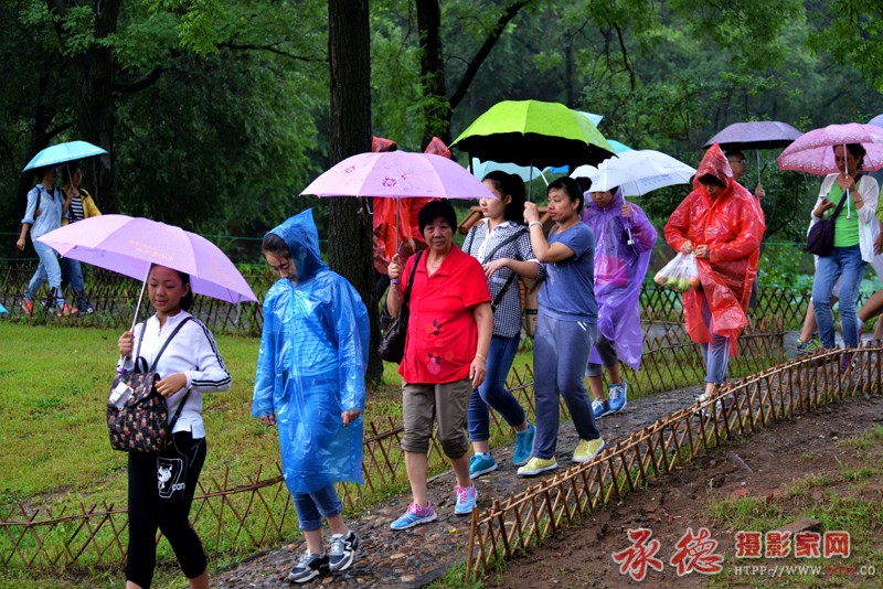 小雨淅淅,挡不住游园的游客,各色服装和各色雨具,显得十分好看,很有故事情节。