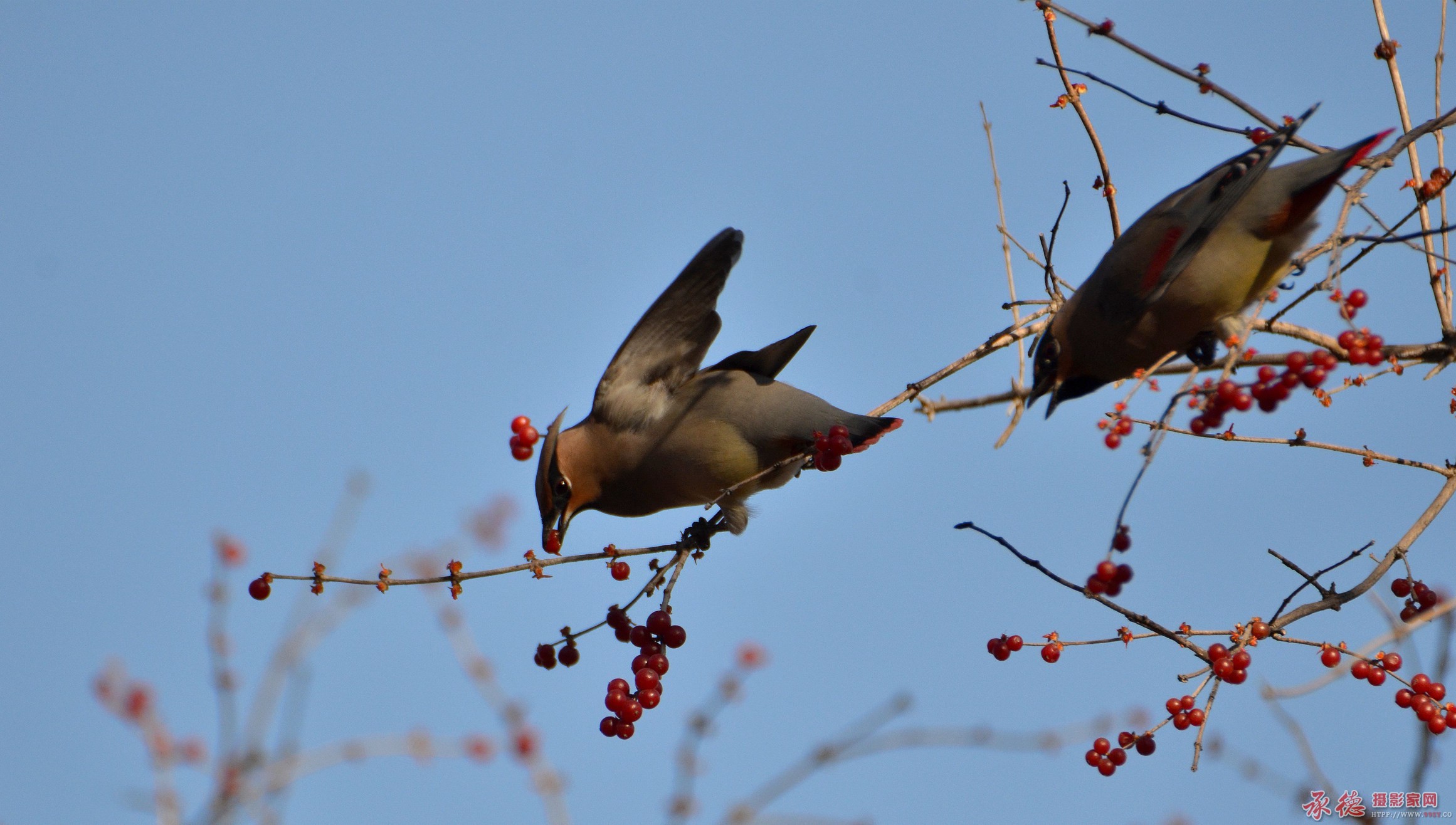 一对太平鸟 ,耳磨厮鬓,窃窃私语,很有故事情节。